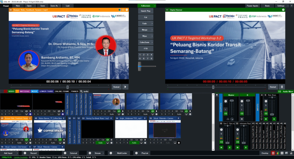 Dalam acara seperti ini, yang paling penting adalah bagaimana kamera, audio, presentasi, dan tampilan speaker bisa tersusun rapi di layar. Karena itu, vMix lebih relevan.