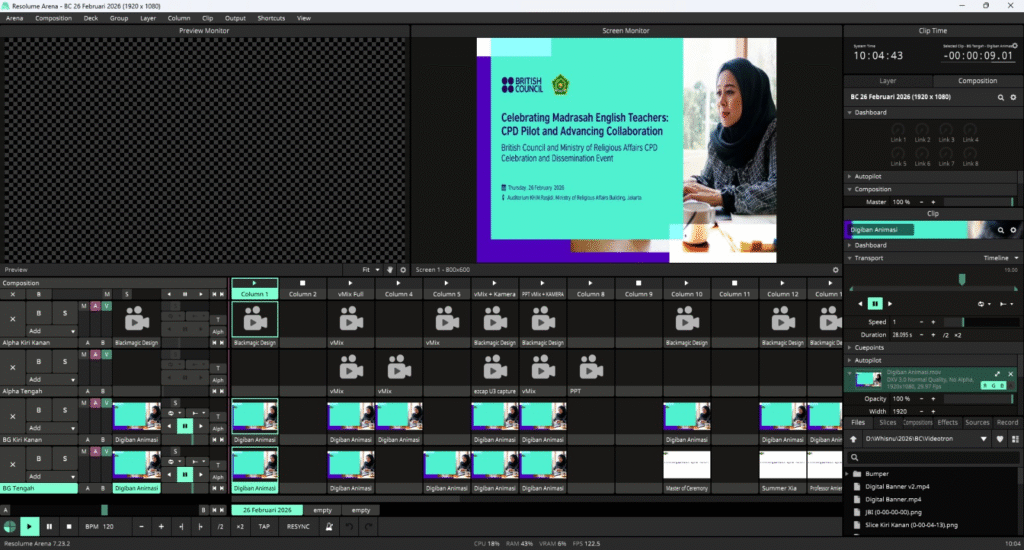 Jadi, kalau vMix lebih dekat ke kebutuhan siaran, Resolume lebih dekat ke kebutuhan tampilan visual di lokasi acara.